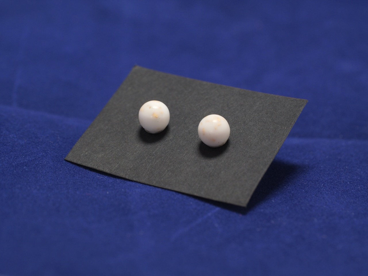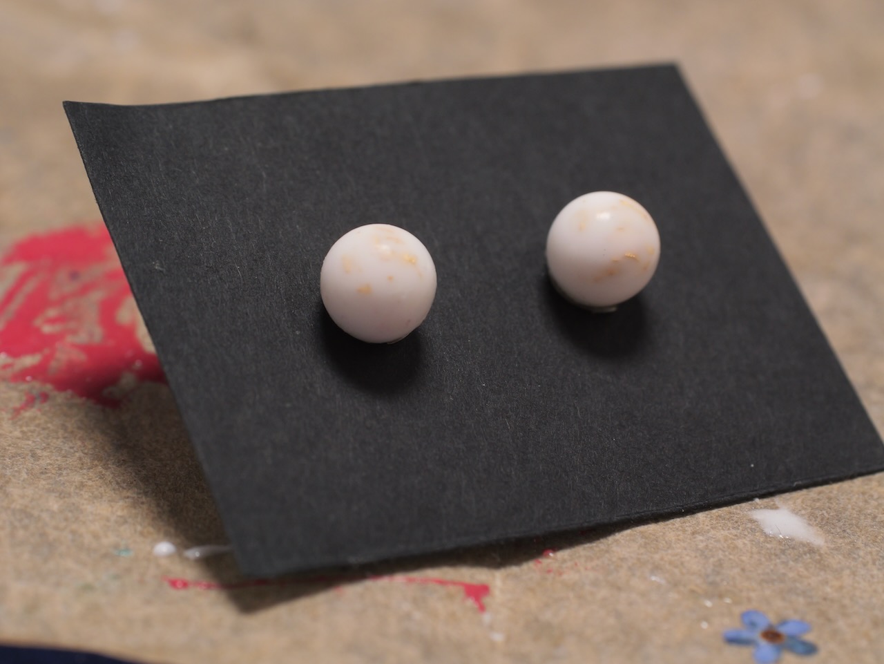 Bílé náušnice kulička s kousky zlata a jemným mramorovým efektem.